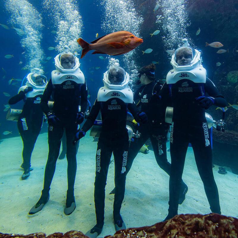 Take an aquatic adventure with SeaTREK, a guided underwater walking tour designed for non-divers ages 10 and up. Held in our 15-foot-deep Heart of the Sea habitat, SeaTREK lets you explore coral caves alongside a rich diversity of Indo-Pacific marine life like the Māori wrasse, blue speckled grouper, spotted unicornfish, and even a loggerhead sea turtle. With no swimming required, this immersive experience offers unique access to the underwater world.